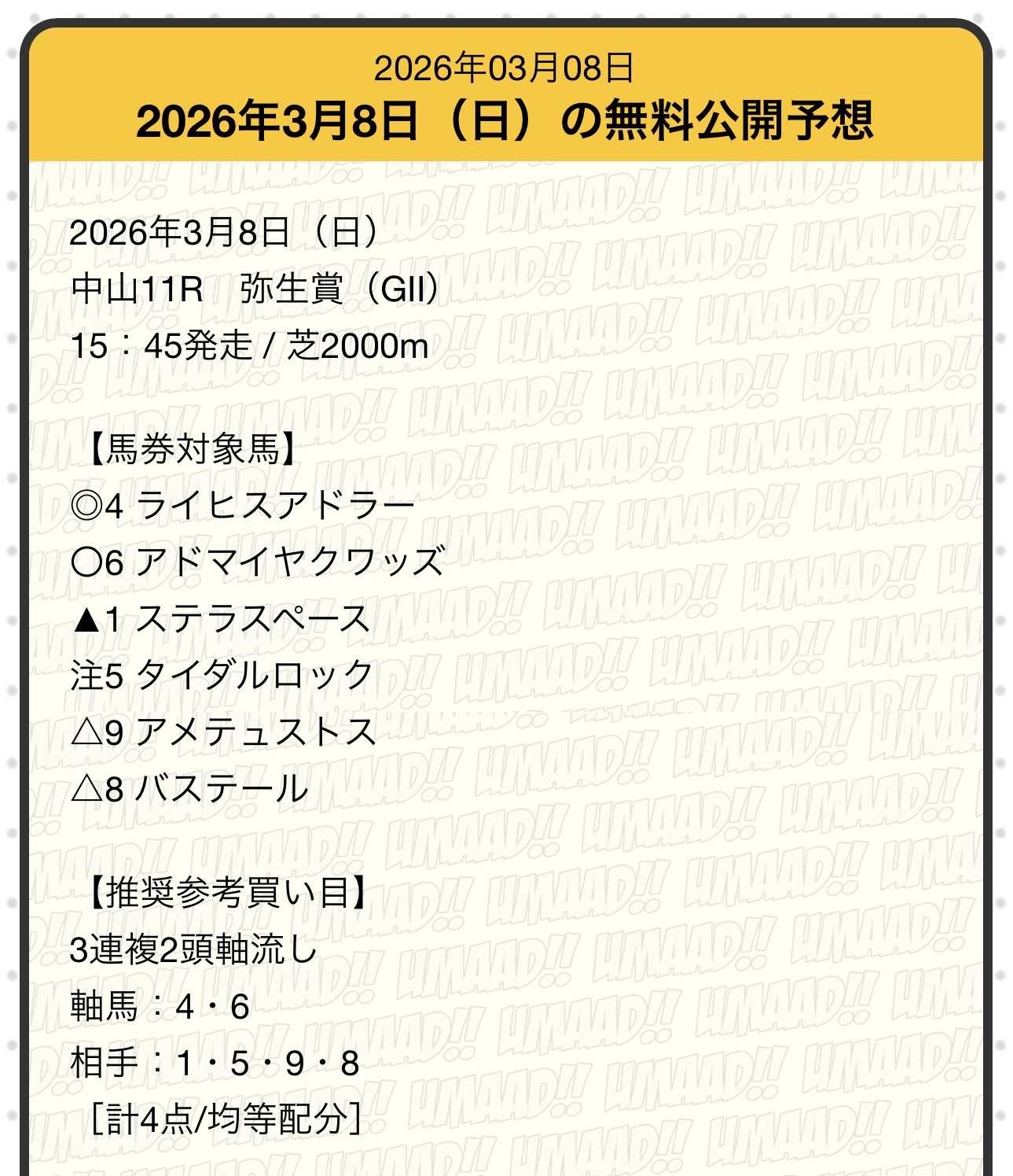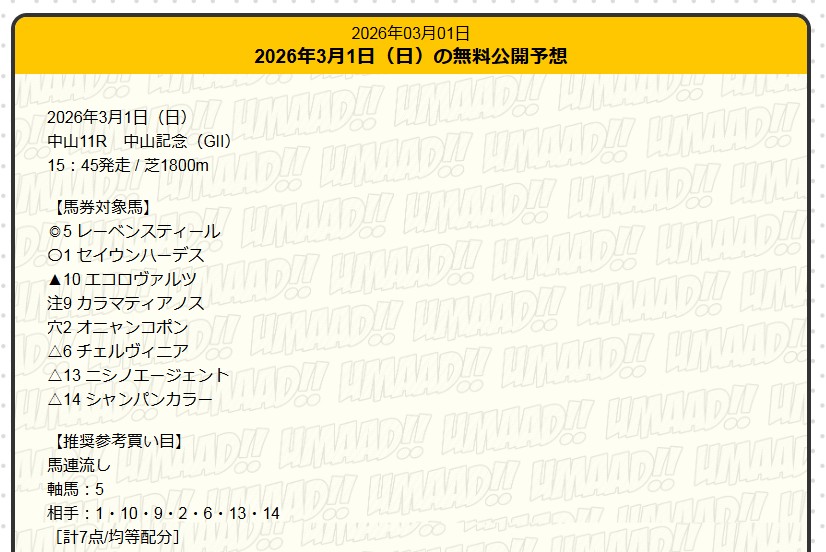 見事に無料予想で的中を届けてくれたのはうまあど