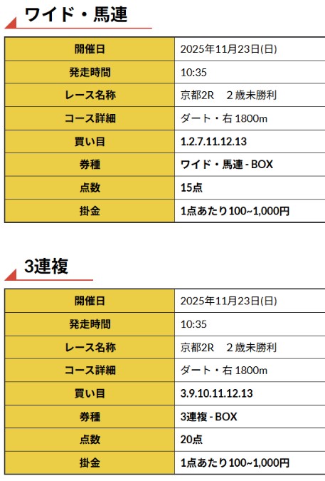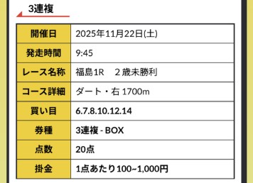 提供された2日分の買い目を口コミ連投するので確認して下さい。