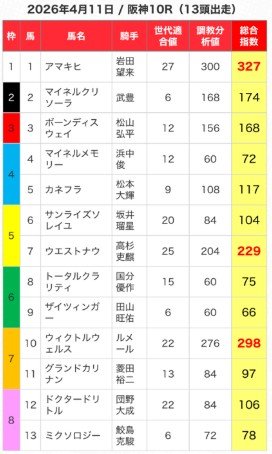 4月11日(土)の阪神10R、うまジェネは三連複がたった1点、三連単も6点だけ。無駄に広げていないのに、①アマキヒ、⑦ウエストナウ、⑩ウィクトルウェルスの3頭でしっかり決着して、払戻総額は5万6600円でした。